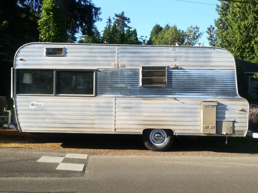 She’s a 1963 Kenskill, twenty feet long and sporting a fridge, stove, shower, toilet, sleeping accommodations for four (if two of them are very small) and–God help me– pink sinks and a pink toilet.