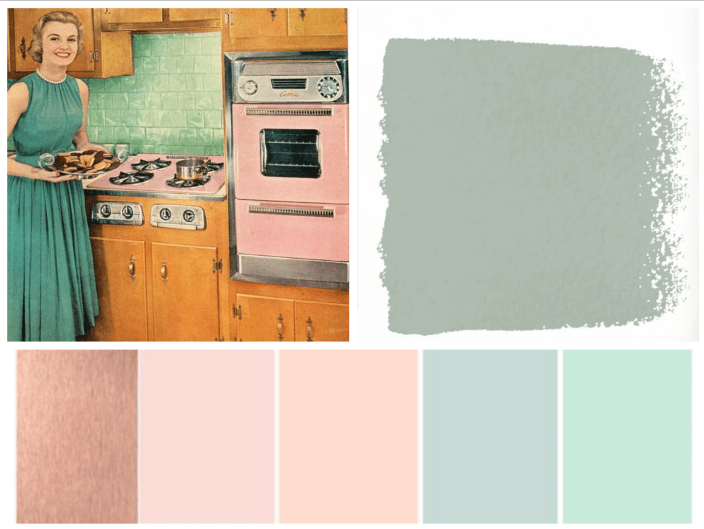 So pink and copper create the “border” colors. I have to paint within those lines. Now I need a third color. This will be the BIG color, the color of the cabinets, drawers, trim & accessories, and a full third of the exterior design.