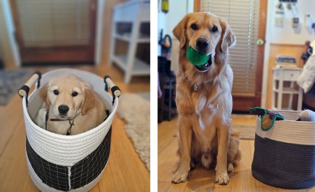 I brought Snickerdoodle home in a basket. We had a four-hour drive from the breeders in Payette, Idaho. During the journey, we stopped three times for him to pee and once to clean barf off my pants.